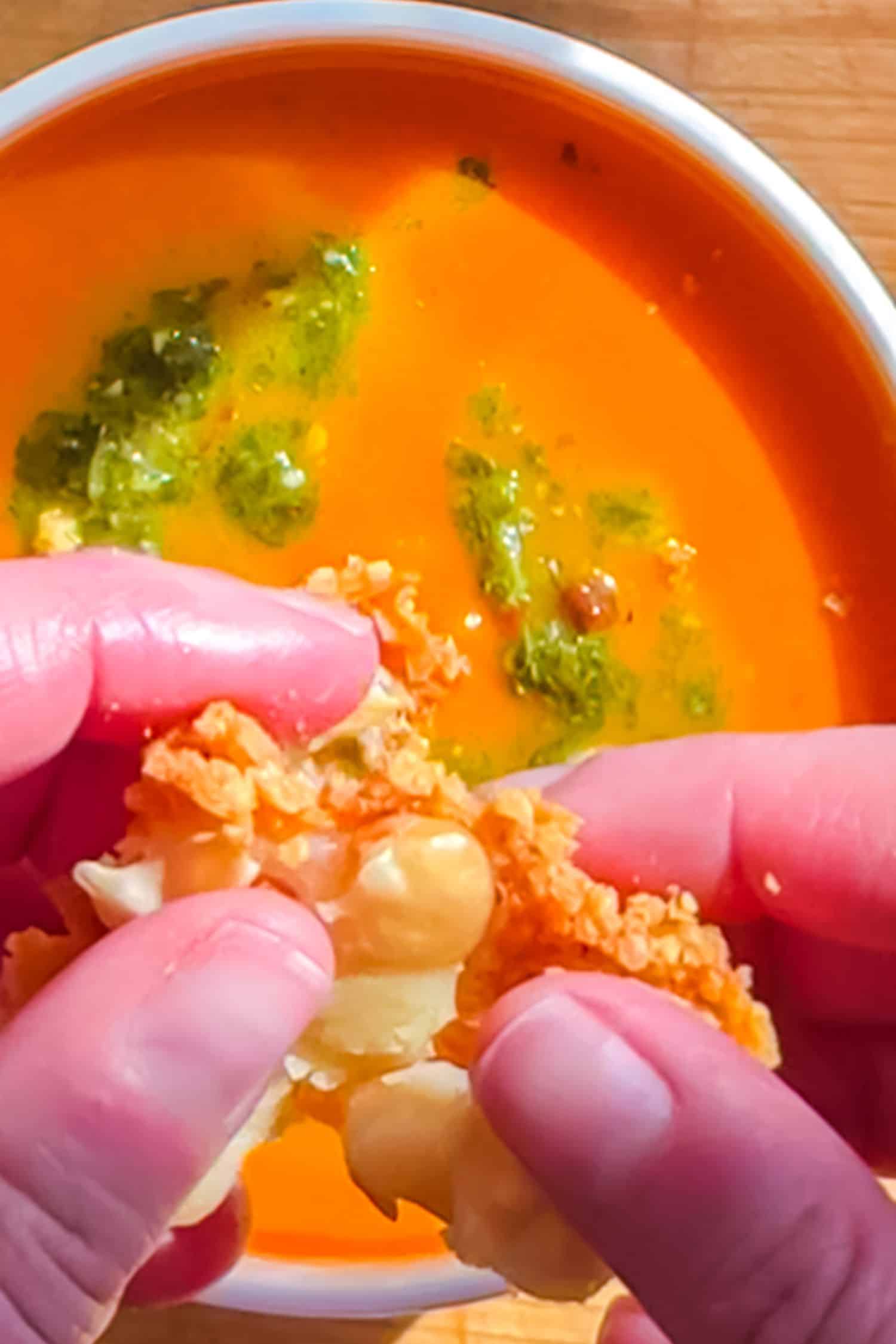 - Broken into pieces over Roasted Pepper and White Bean Soup